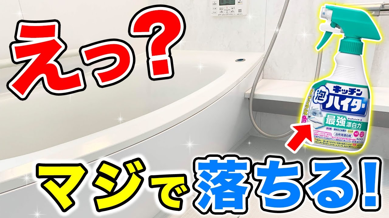 普通のバスクリーナーではゴシゴシこすらないといけない汚れも、塩素系洗浄剤の「キッチン泡ハイター」を使うと楽に落とせるんですよ〜!