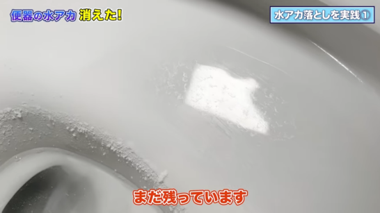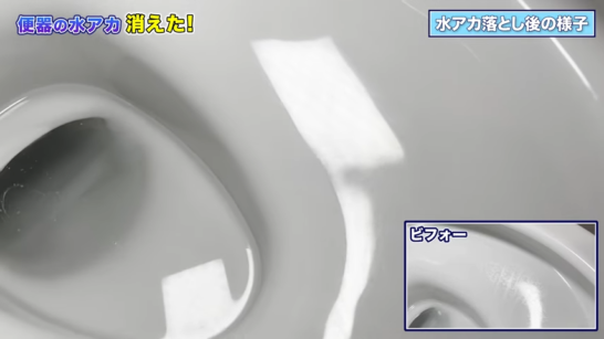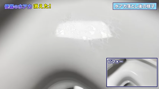 「茂木和哉 極」: 重曹では落ちなかった水垢をしっかり落とし、便器の見た目をかなりスッキリさせることができます。