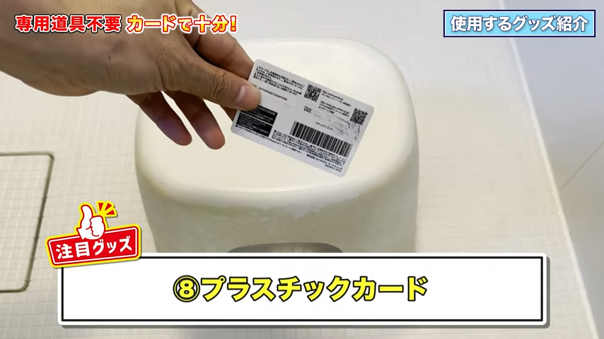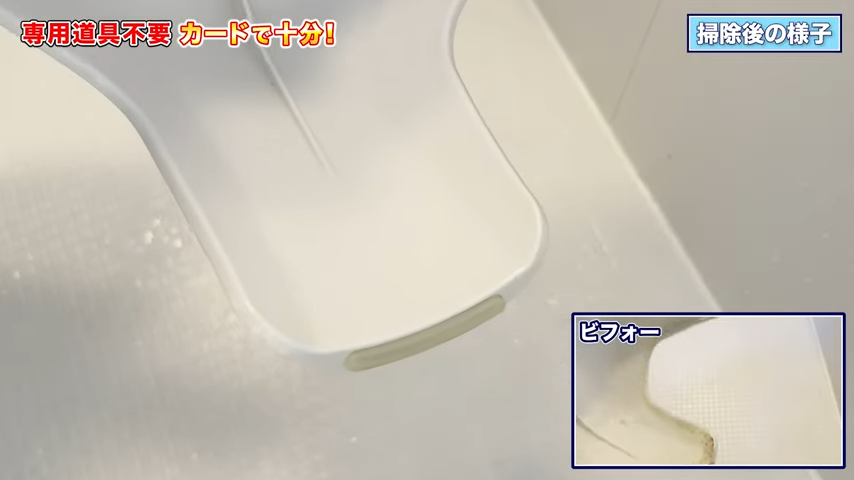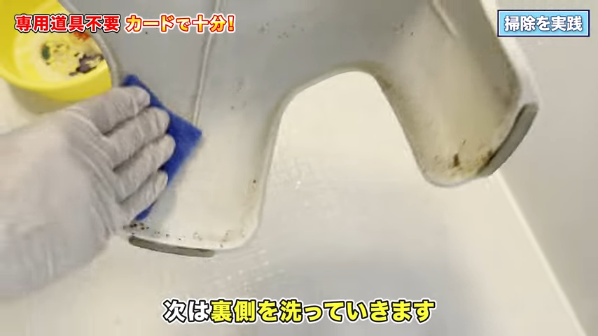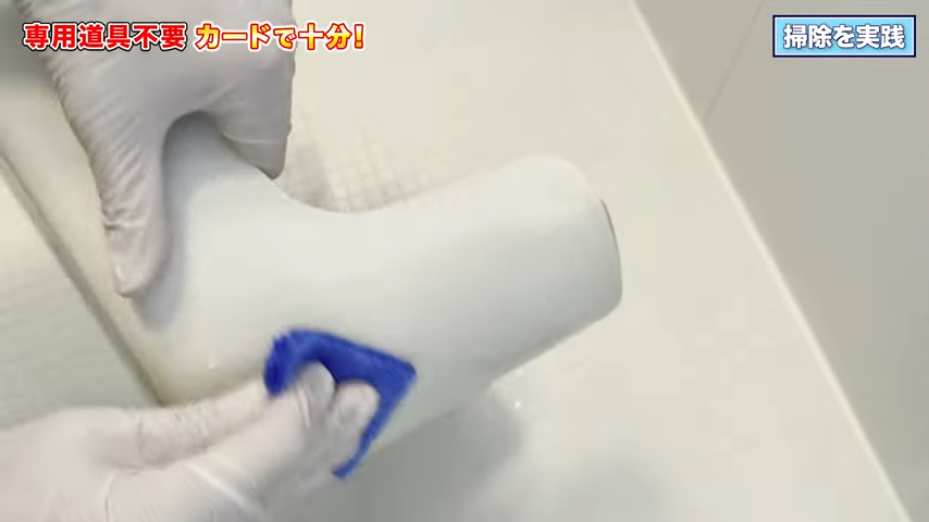 プラスチックカードで石けんカスをこそぎ落とす