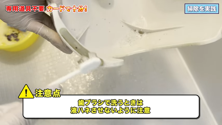 力を入れすぎると、洗浄液が飛んで顔や服につくことがありますので、ブラシはゆっくり動かして、慎重に作業してください……!