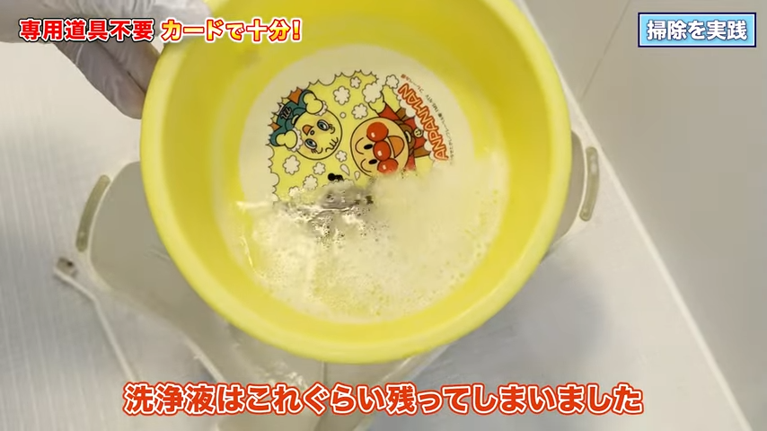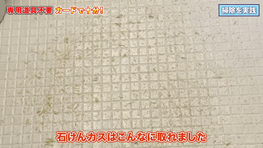 石けんカスが分厚くついている場合、濡れていると削りにくくなるので、最初にカードでしっかり落としてから洗剤で仕上げる、という順番がとても効率的です!