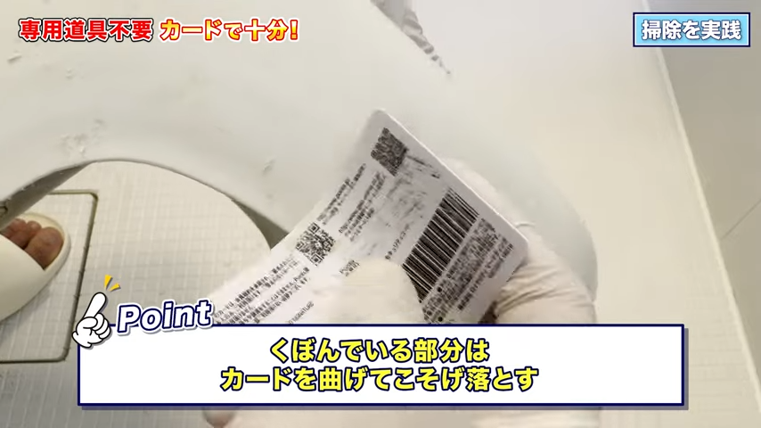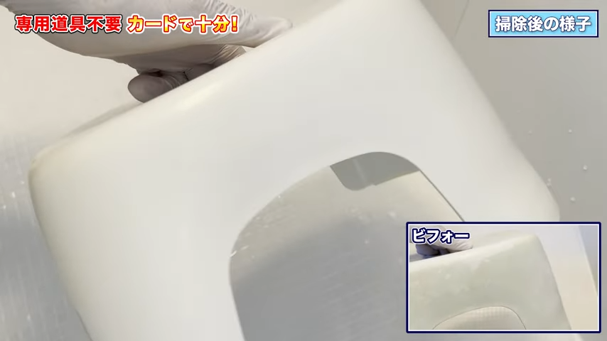 まずは、この乾いた状態のまま、分厚くこびりついた石けんカスをカードでこそぎ落としていきます。実際にやってみると……こんなふうにカンタンに削れるんですよ!