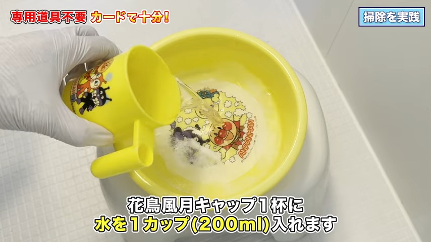 それではお掃除用の洗面桶に「花鳥風月」をキャップ1杯入れていきます。キャップ1杯に対して、水は1カップ(200mL)ですね!