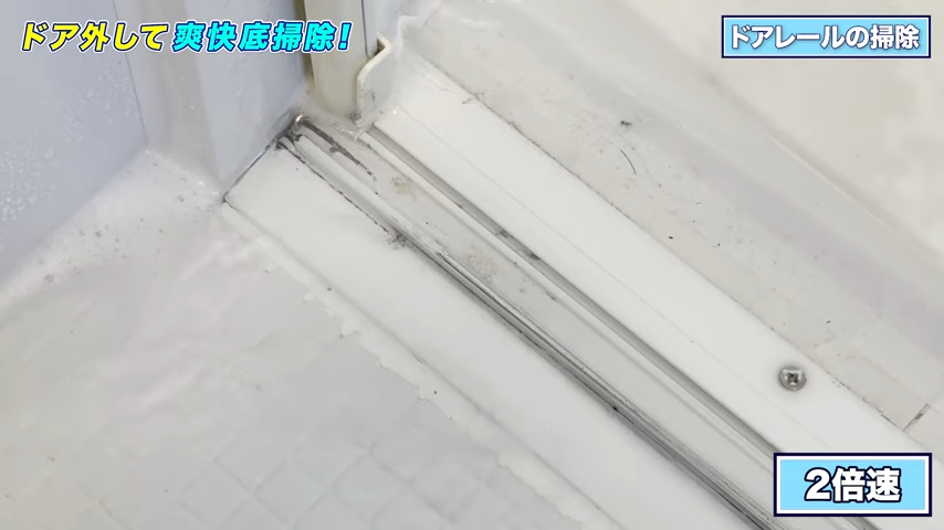 シャワーの水をドアレールにかけて、泡と一緒に汚れを流していきましょう。さっき作った土手があるので、脱衣所側に水が流れていかないのが安心ですね!