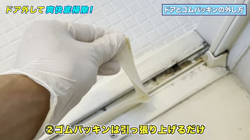 今回は、お風呂のドアと、レールについているゴムパッキンを外して、丁寧に洗っていきます。ここを外して洗えると、汚れの落ち方が一気に変わるんですよ~。