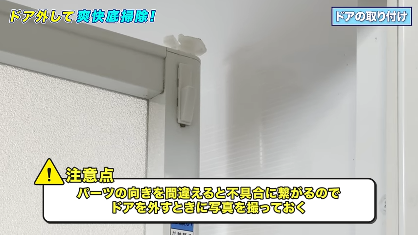 次はドアの上側をはめ込んでいきます。右と左で同じようなパーツが付いているんですが、向きを間違えると不具合につながることがあります。なのでドアを外すときに写真を撮っておくのがおすすめです。