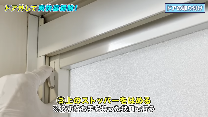 上側の取り付けができたら、最後にストッパーを戻します。ドアを外すときに下げた、上のストッパーですね!ここは必ずドアの持ち手を持った状態で作業します。