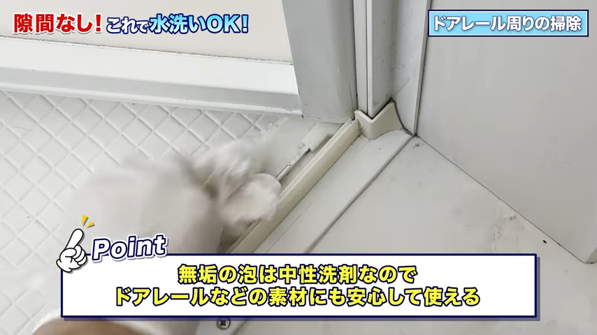 次は洗剤を拭き取っていきます。今回使っている「無垢の泡」は中性洗剤なので、こういったレールの素材にも使いやすいのが安心です!