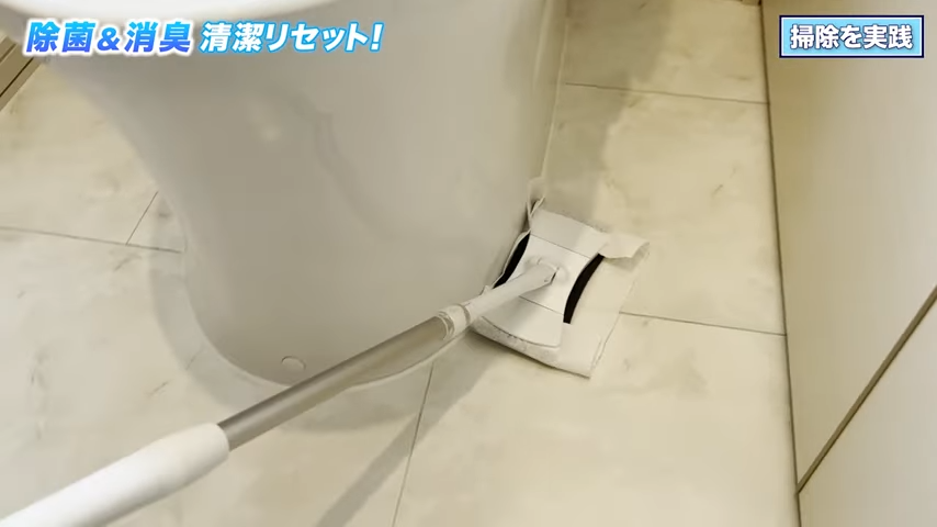 拭き掃除: おしっこが飛び散りやすい床や壁の下の方を中心に、ワイパーで念入りに拭く。