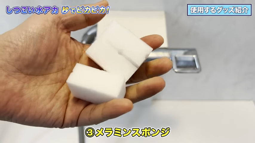そして今回のメインが、メラミンスポンジです。あらかじめ持ちやすいサイズにカットされているタイプを使っていきます。細かいところにも当てやすいので、蛇口まわりには相性が良さそうです!