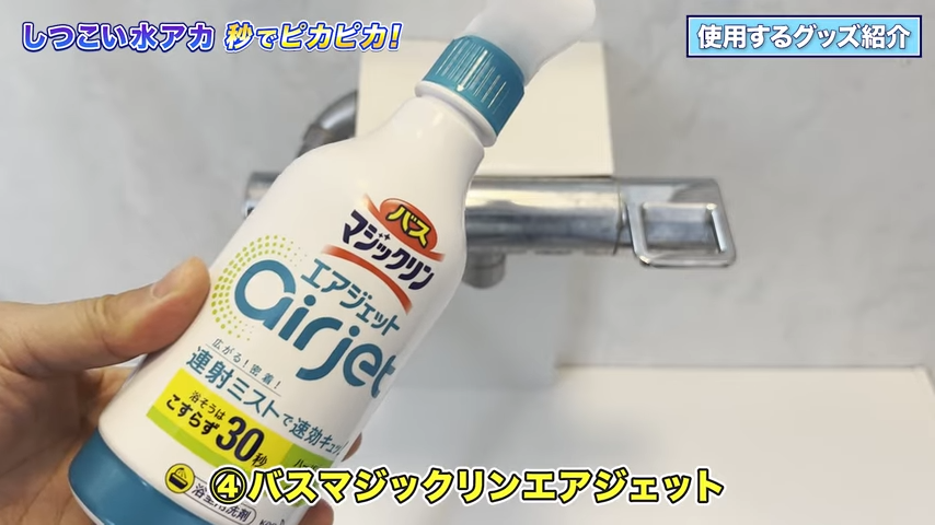 ただ、いきなりメラミンスポンジでこするのではなく、最初に普通のバスクリーナーで全体を洗っておきます。僕が普段使っているのは「バスマジックリンエアジェット」なので、今回はこれを使っていきます。