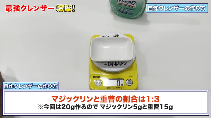重曹と「マジックリン」の割合の目安は1対3。20グラム作るとなると、重曹が15グラム、「マジックリン」が5グラムになります。