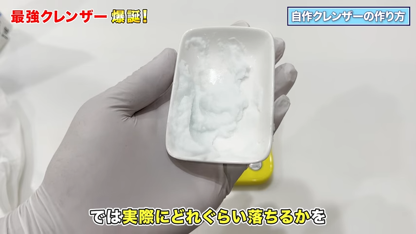 まずはクレンザーを汚れの上にのせて、指でどれくらい落ちるのか確かめてみます。
