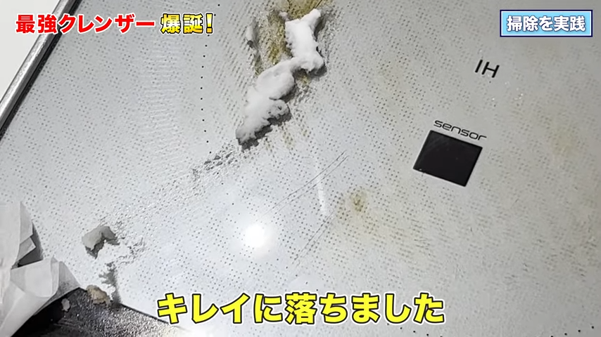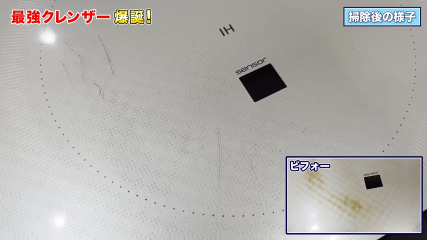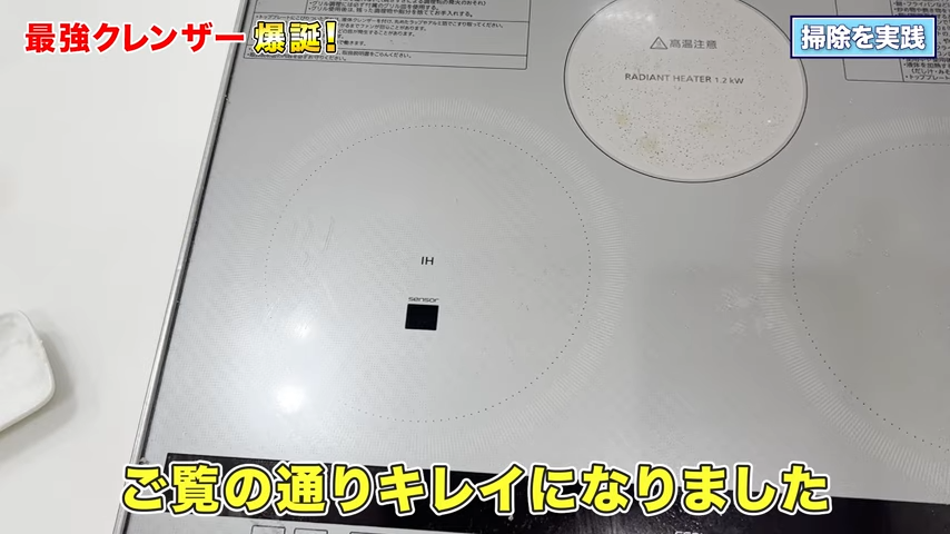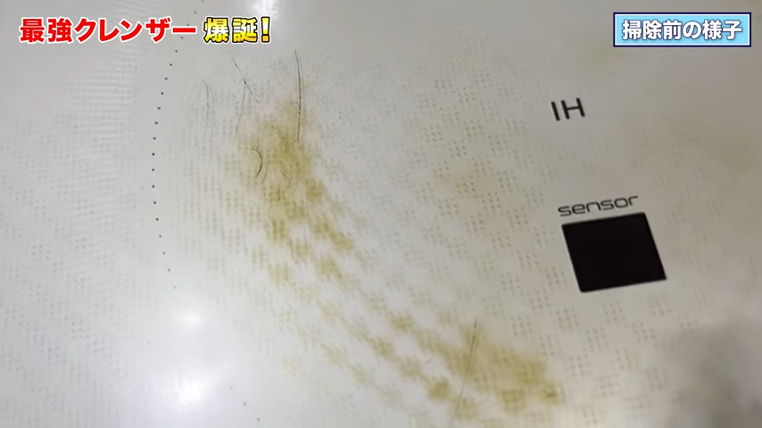 右側のIHにはしっかり固まったこびりつき汚れがあります。近くで見ると、なかなか手強そうですね。どこまで落ちるのか気になります……!