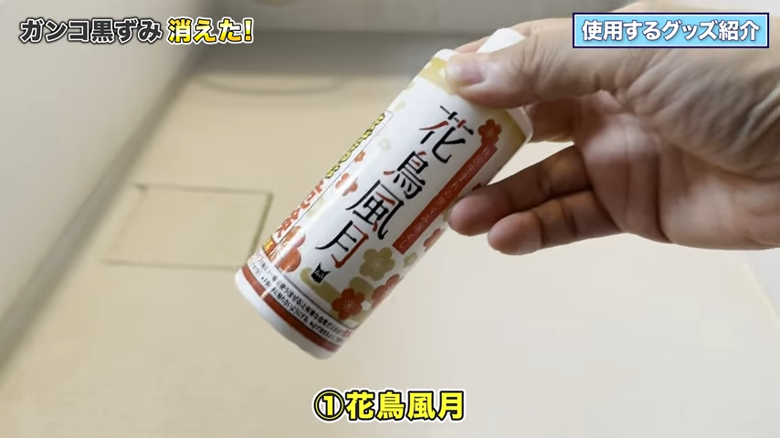 お風呂の床にこびりついた頑固な黒ずみやピンク汚れを、専用洗剤「花鳥風月」で一掃する方法です。