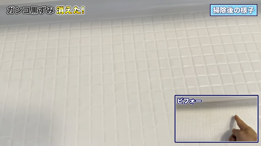 特にタイルの溝に、黒ずみ汚れやピンク汚れが入り込んでいて、普段の掃除だけだと残りやすい感じがします。