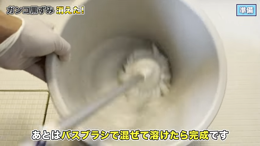 次は希釈液づくりです。まず、マグカップに水を1杯くんでバケツに入れます。そこに「花鳥風月」をキャップ1杯分入れて、バスブラシでぐるぐる混ぜていきます。洗剤がしっかり溶けたら、これで洗浄液の完成です!