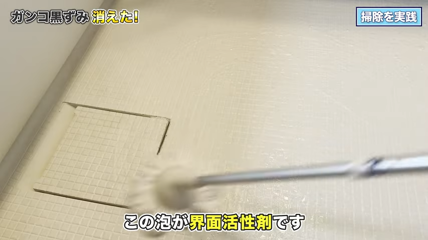 ちなみに、洗浄液の量がそこまで多くないので見えにくいかもしれませんが、床にはうっすら泡がのっています。この泡が界面活性剤の働きなんだそうです!