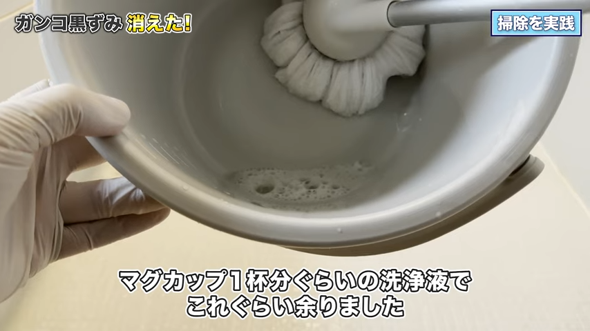 ちなみに……床全体に洗浄液を塗りつけても、意外と洗浄液はたくさんいりませんでした。うちのお風呂の床は畳1畳くらいの広さなんですが、マグカップ1杯分で作って、まだ少し残っていたんですよね。