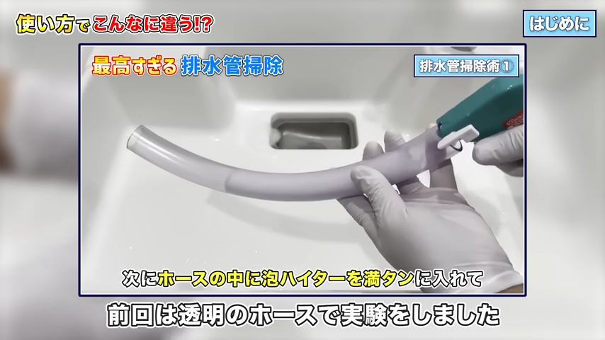 そのときの実験では、透明のホースを排水パイプに見立てて、実際に泡の動きを見ていきました。泡が流れていくことなくとどまってくれるので、汚れ落ちの違いが一目瞭然でした!