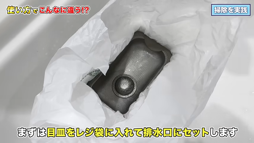 あとは、その袋を排水口の上にのせるだけ。これで排水口の栓が完成です!