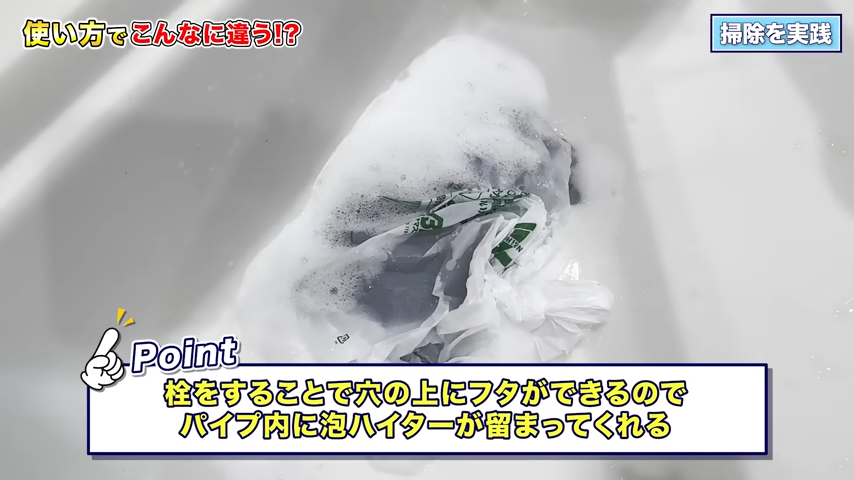 これだけで排水パイプの中がほぼ真空状態になり、泡がしっかりとどまってくれるんですよ。