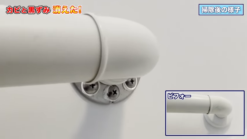 いかがでしたでしょうか?今回は「キッチン泡ハイター」と「橙の雫」を使って、浴室の手すりをお掃除してみました。