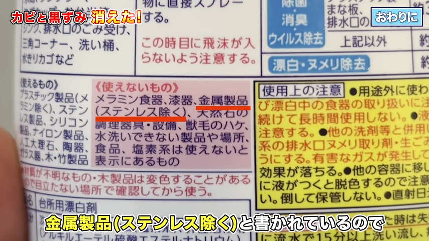 とはいえ、「キッチン泡ハイター」のラベルをよく見ると、使えないものの欄には「金属製品(ステンレスを除く)」と書かれています。つまりメーカーさんとしてはステンレスにも使える、という扱いなんです。