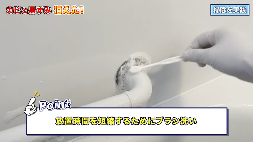 「キッチン泡ハイター」だけでなくブラシ洗いもいれることで、短い放置時間でも汚れが落とせる、というわけですね〜!