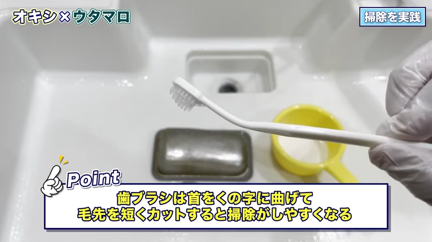 排水口の目皿は、曲げた歯ブラシを使って丁寧に洗う。