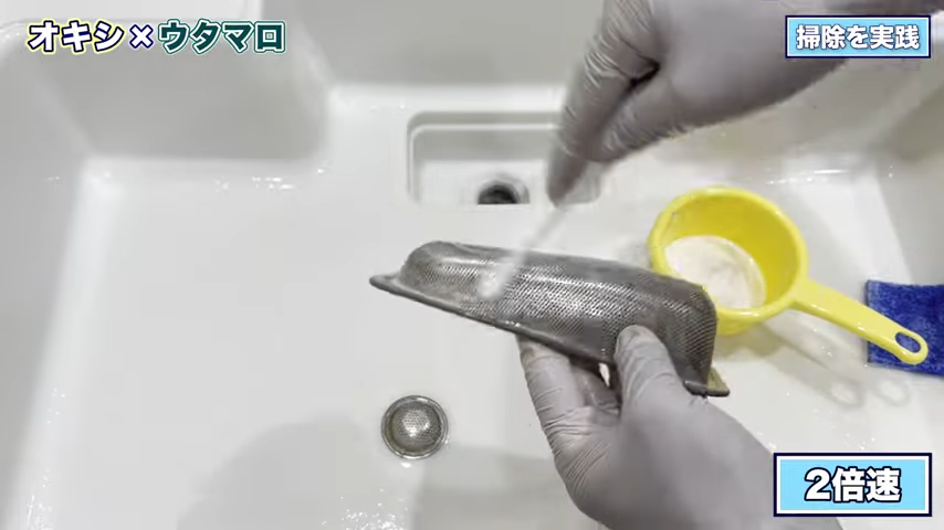 目皿には「ウタマロオキシ洗浄液」を塗り広げて、ブラシでゴシゴシ……。