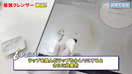2つ目も重曹と「マジックリン」の組み合わせ。こっちではIH天板と鍋裏のコゲ取りをしているよ。