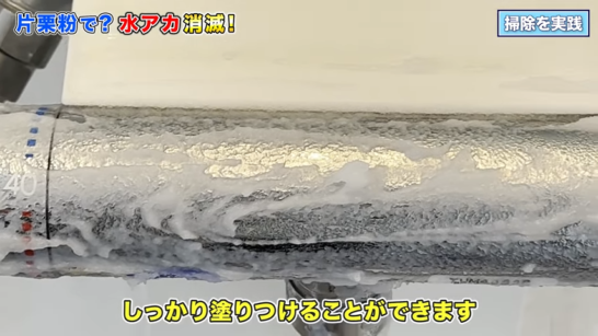3つ目はお風呂のカランの水垢を取っていく動画。なんとクエン酸と片栗粉を混ぜてジェルにしているよ。