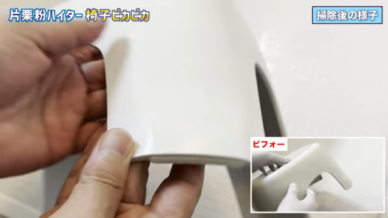 イスを軽く水洗いした後、ハイタージェルを手で塗り広げて20分ほど放置、そのあと研磨スポンジでこすり洗いすればモヤモヤ汚れや黒カビもすっきりキレイに。これは試してみたい……!