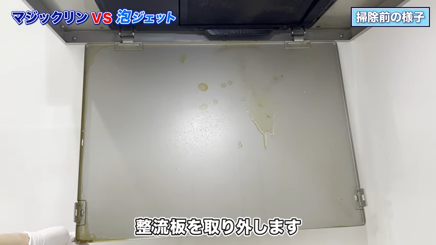 本記事ではレンジフードの整流板を左右に分け、「キッチンマジックリン」と「キッチンマジックリン泡ジェット」の洗浄力を比較しました。