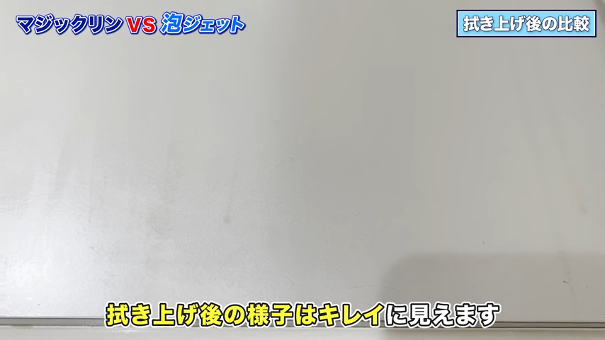こっちのほうが、拭き上げ後の見た目はキレイに見えますね。パッと見のスッキリ感は、普通の「キッチンマジックリン」が優勢です。