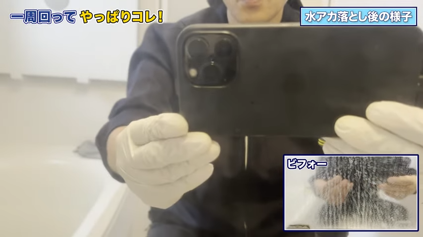 2つ目は「茂木和哉」でお風呂の鏡の水垢を落としていく動画。今回はラップでつくった「ラップたわし」で磨いているよ。