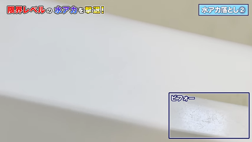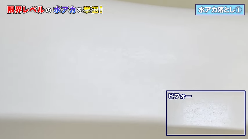 4つ目はバスタブのヘリについている水垢を「茂木和哉キッチン用」と「金鬼」で落としていく動画だよ。