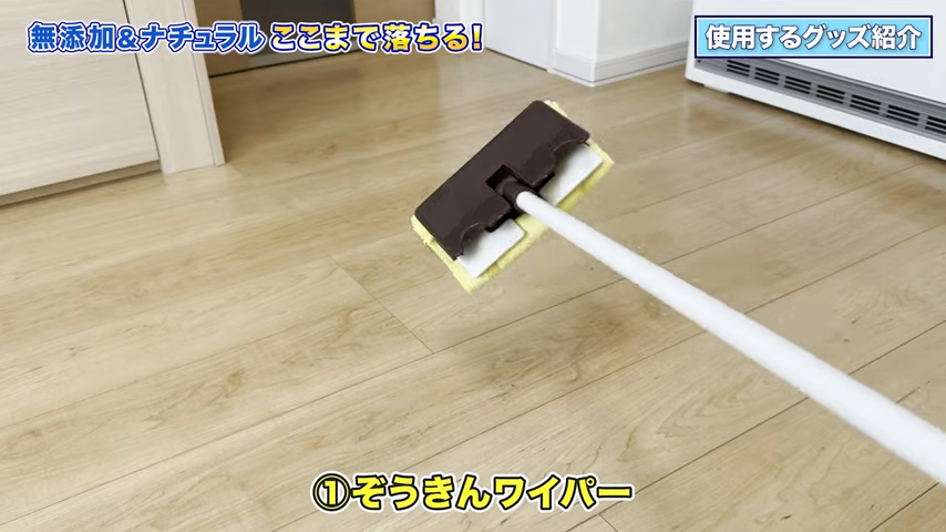 使う道具は、まず「ぞうきんワイパー」です。クロスを取り付けて使うタイプのワイパーですね。立ったまま広い面を拭けるので、床掃除のハードルが下がるのがありがたいです!