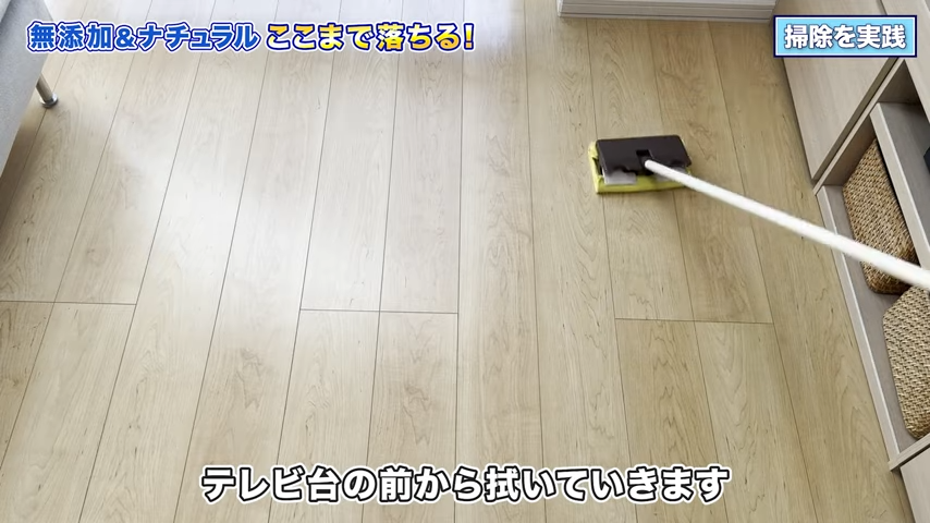 今回はリビングとダイニングのフローリングを、しっかり拭き掃除していきます。