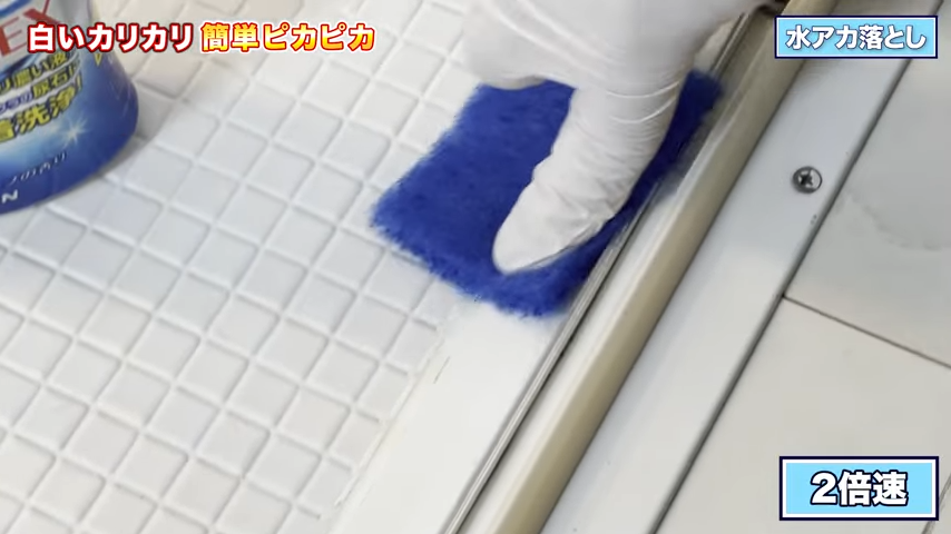 この動画で僕がなるほど!と思ったのは、バスブラシと研磨スポンジを使い分けていくところかな。 ガンコな汚れは研磨スポンジ、それ以外の広いところはバスブラシでざっと洗う……と、道具を使い分けることで、念入り掃除もすごく効率よく進められるんだ!