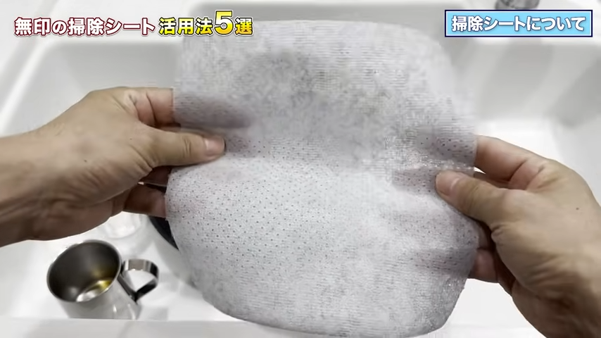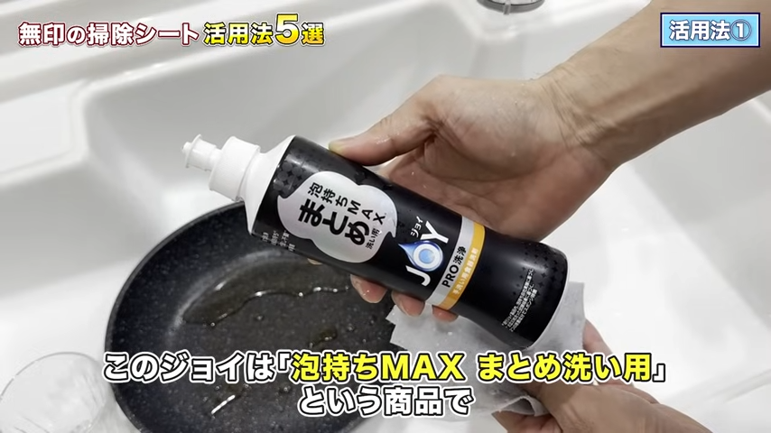 「水回りの汚れ用掃除シート」は、いろんな洗剤と組み合わせて使えます。たとえば、食器用洗剤の「ジョイ」を少しかけて磨く方法や、キッチン掃除用の洗剤を使う方法がありますね。