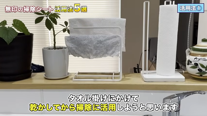 そして、その使い終わったペーパータオルはすぐ捨てずに、タオル掛けにかけて乾かしています。しっかり乾かしたあとで、シンクまわりやコンロの掃除に再利用しているんですよ。こうすると無駄がなくて、ちょっと気持ちいいんです!