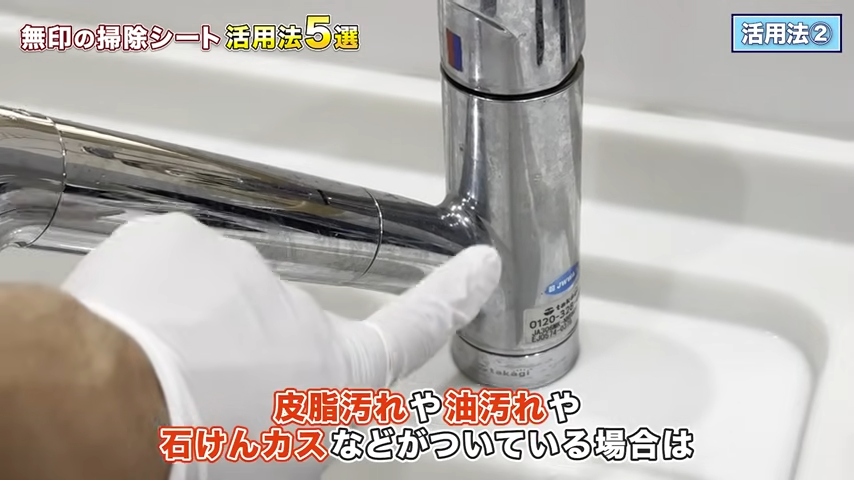 ここからは、一度使ったシートを掃除に活用していきます。せっかくシンクにいるので、まずは蛇口まわりからいきましょう。
