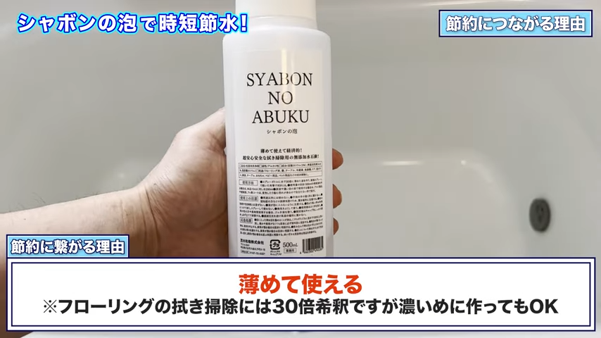 「シャボンの泡」が節約につながる理由、まずひとつ目は水で薄めて使えることです。