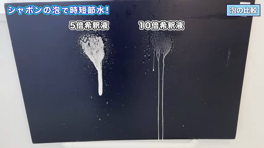比べてみると……10倍希釈液は少しシャバっとしていますが、5倍希釈液はしっかり泡立っていますね。