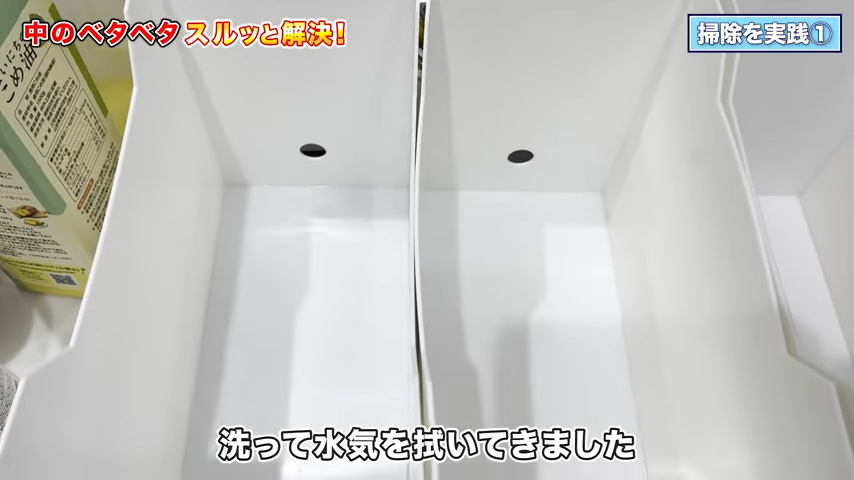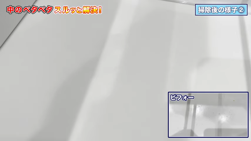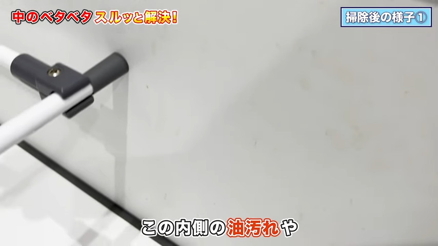 この掃除のポイントは、全体を「シャボンの泡」で拭き、ガンコな部分を「橙の雫」で処理するという洗剤の使い分けです。この方法により、油汚れがすっきり落ち、キャビネット内がベタつきのないサラサラな手触りになります。