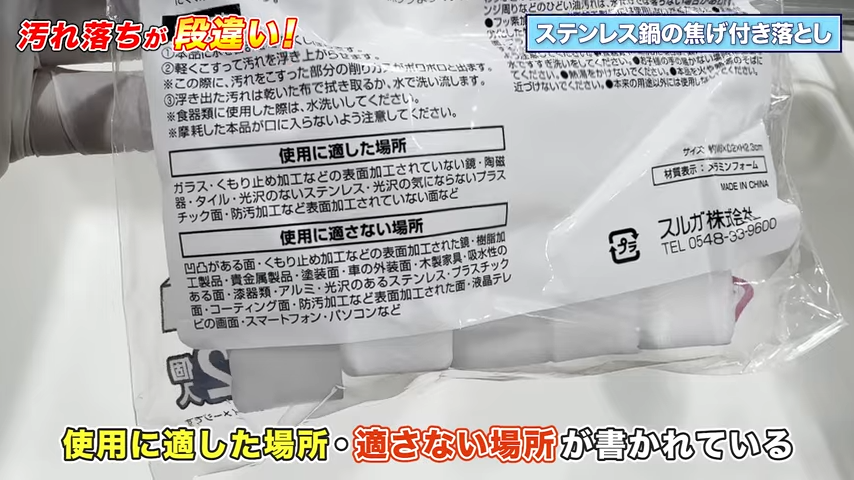 凄腕くんの「高密度メラミンスポンジプレミアム」には、袋の裏に「適した場所」と「適さない場所」がしっかり書かれています。