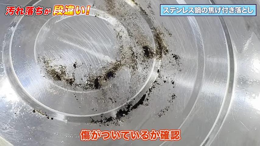 では、少し力を入れてこすってみます。……はい、コゲが一気に落ちましたね!
