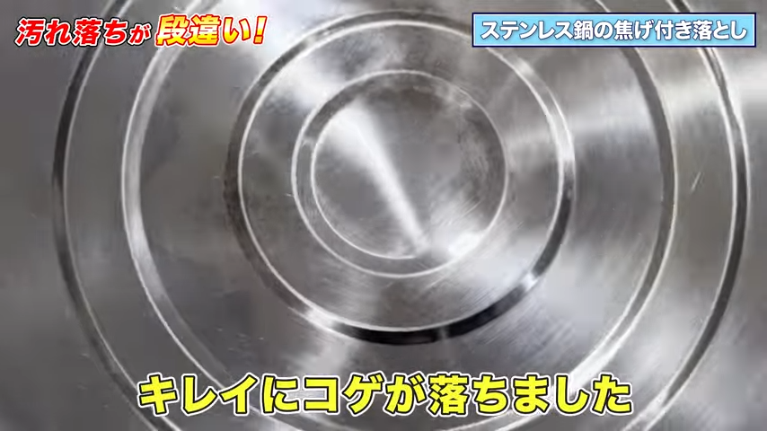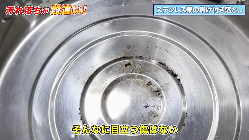 そして光沢のあるステンレス鍋。メーカーさんは推奨していませんが、慎重にこすれば十分コゲを落とせました!多少の傷はつきますが、もともとの傷と大きく変わらないレベルでしたので、僕は今後も使っていこうかなと思います。